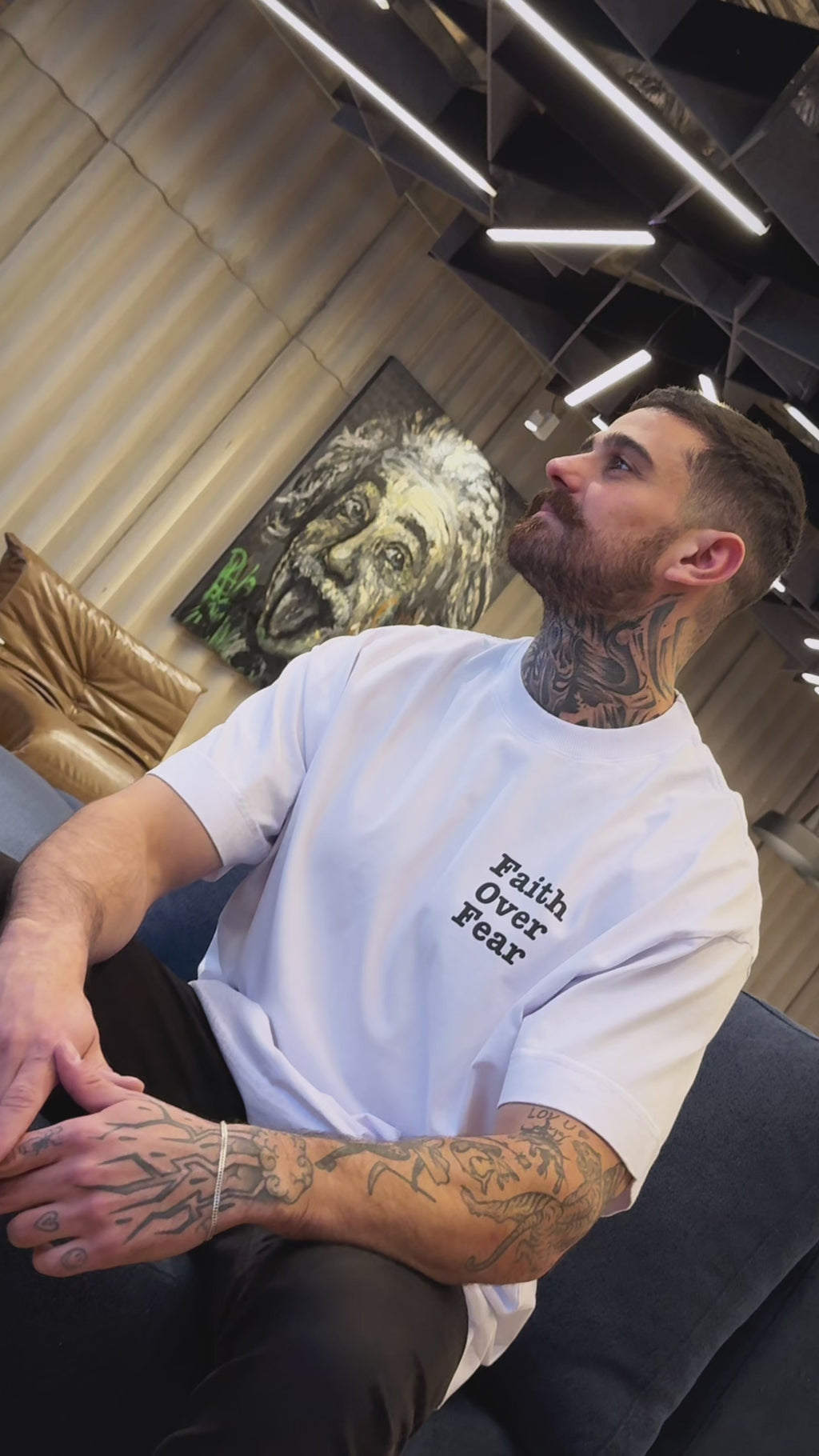 Essa é a camiseta Deus. Minimalista, direta e de impacto, ela representa o ponto em que a força física se curva diante da fé, reconhecendo que há algo maior guiando o caminho.